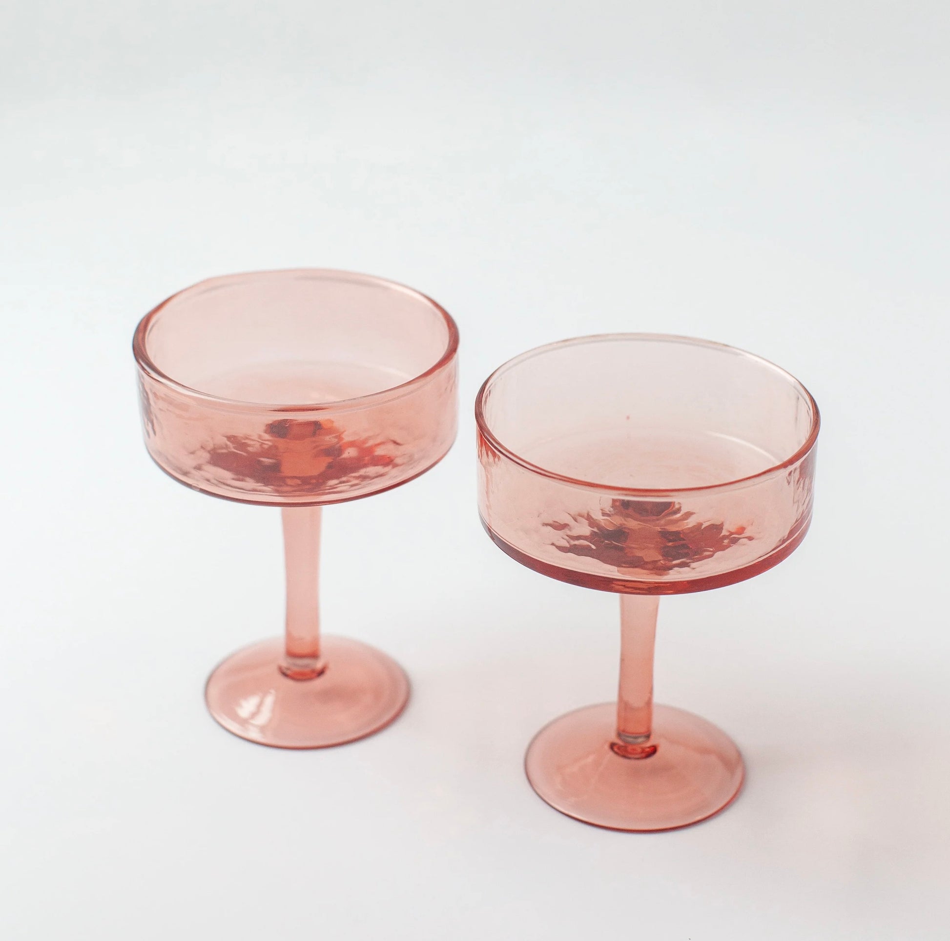 Handblown with a stunning hammered finish, these coupe glasses take your cocktails, mocktails and desserts to the next level. Crafted with care at a woman-owned business, each is ethically made from 100% recycled glass and are sold as a set of 2 glasses.