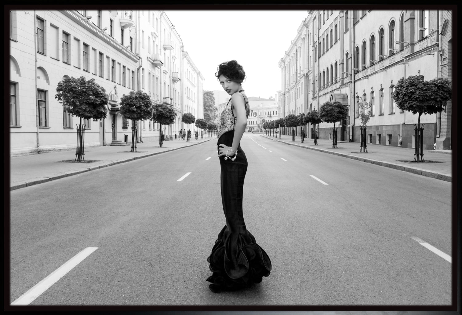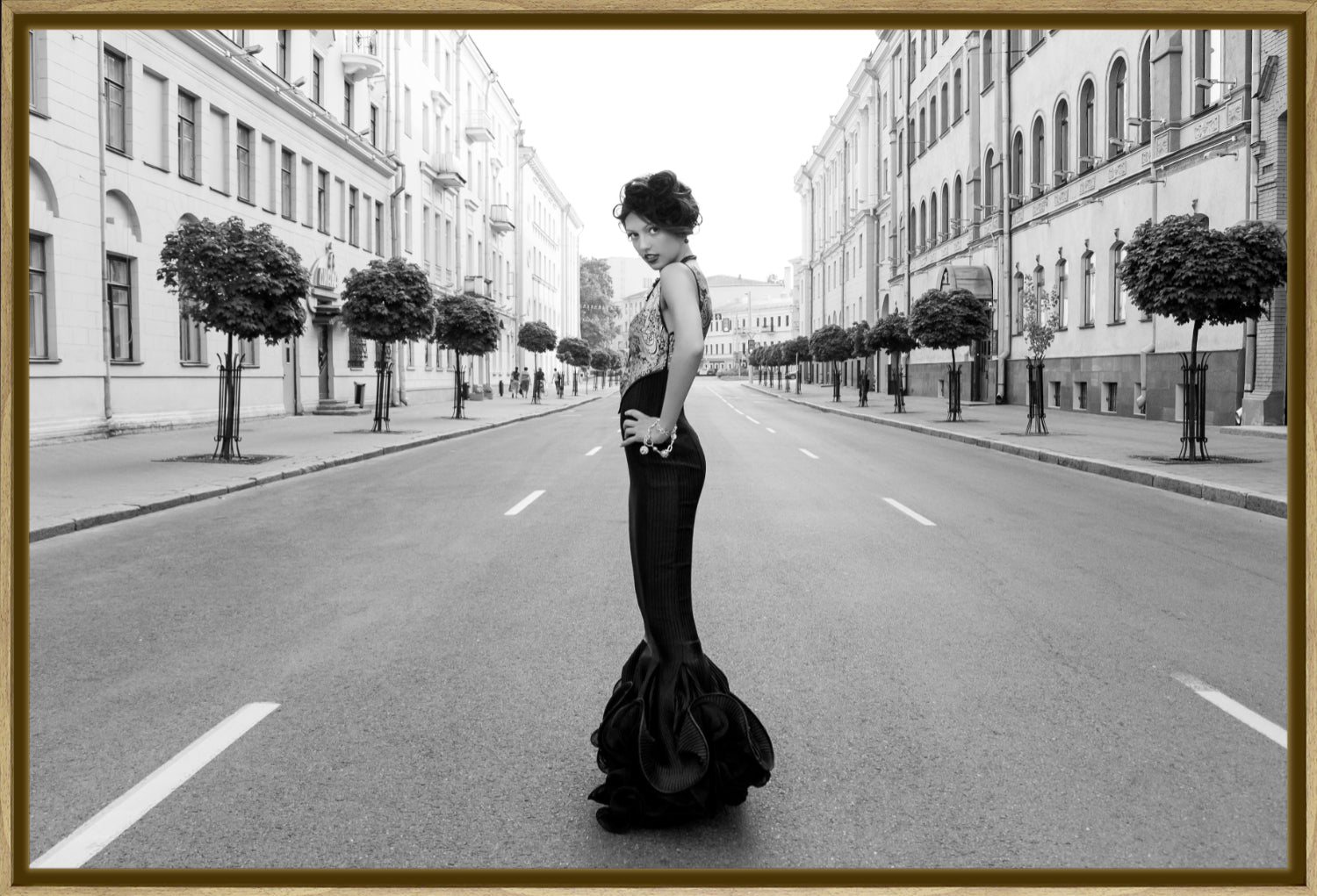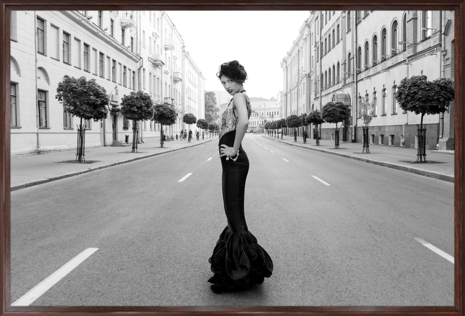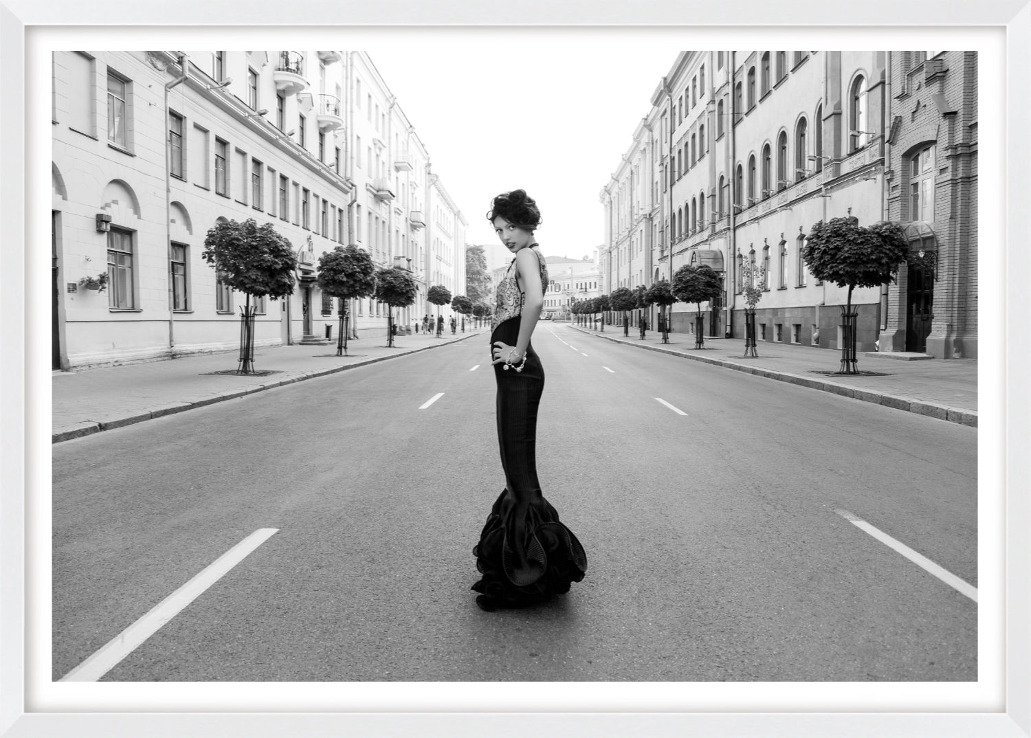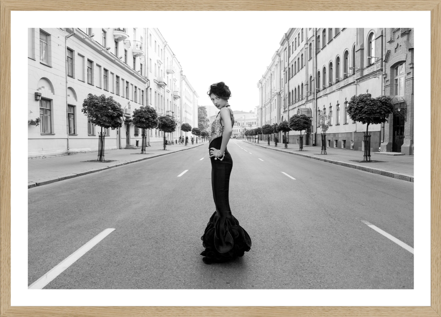 A striking black and white fashion photograph capturing effortless elegance and quiet confidence. Set against a grand European streetscape, this artwork brings editorial drama and timeless style to any interior. Perfect for fashion lovers and modern spaces seeking a bold yet refined statement.