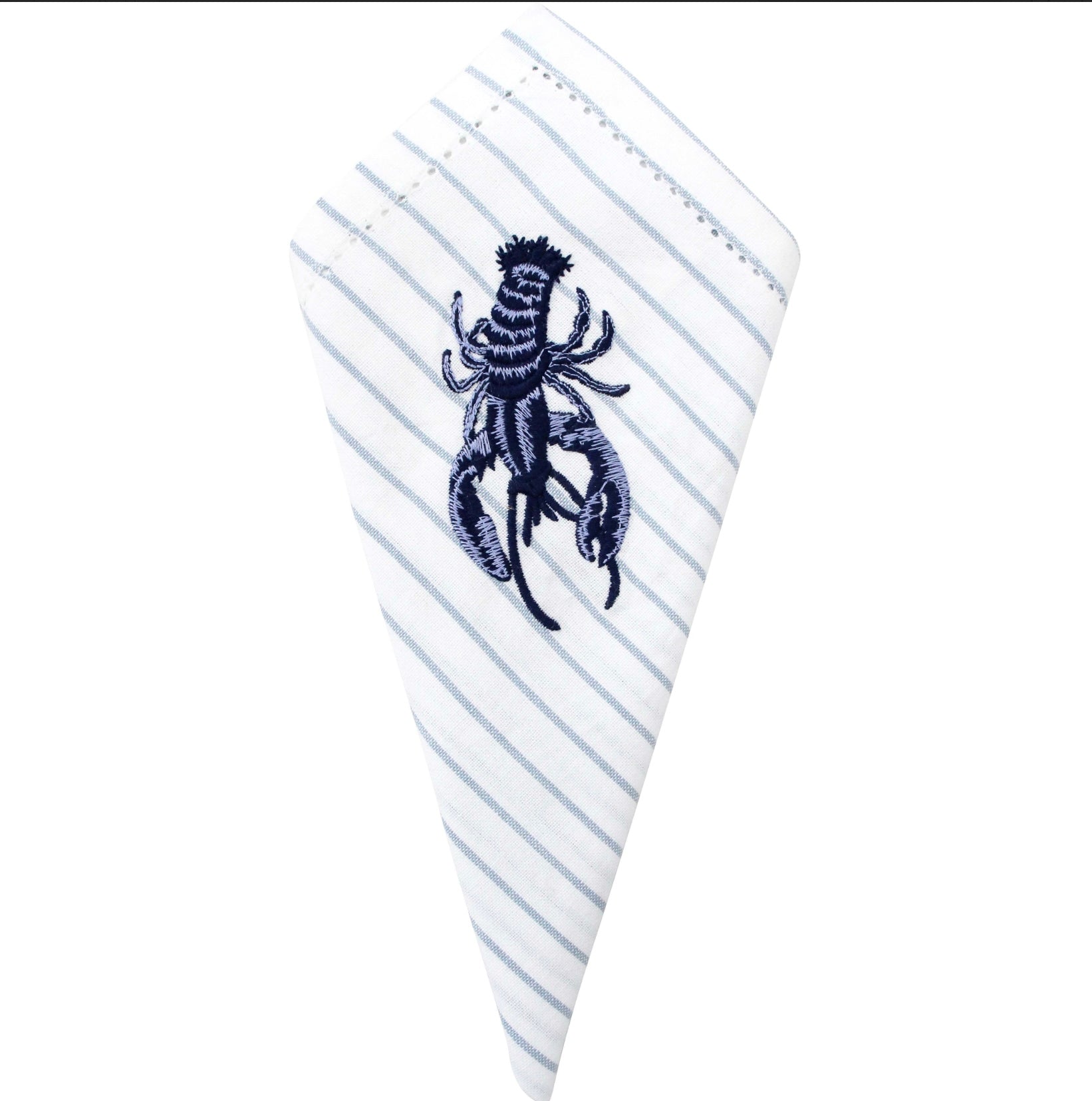 Crafted from stonewashed chambray cotton, this light blue striped napkin features a delicate embroidered Lobster motif. A perfect match for our Lobster Tea Towel Set, it adds a soft coastal touch to any table.