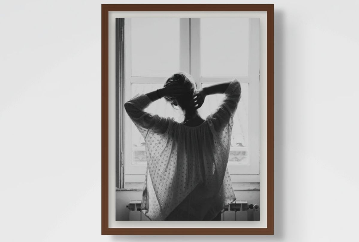 A timeless black and white fashion wall art print featuring a softly lit figure by a window. This elegant portrait artwork brings a calm, editorial feel to bedrooms, living spaces and contemporary interiors.